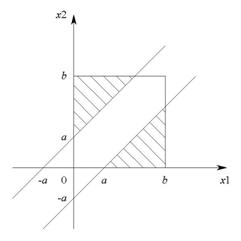 のとり得る領域を図示すると,図4に斜線で示したように,平行な2直線:x2 = x1-a,x2 = x1+aにはさまれる領域の外側でかつ,図3の正方形の内部の領域になる.