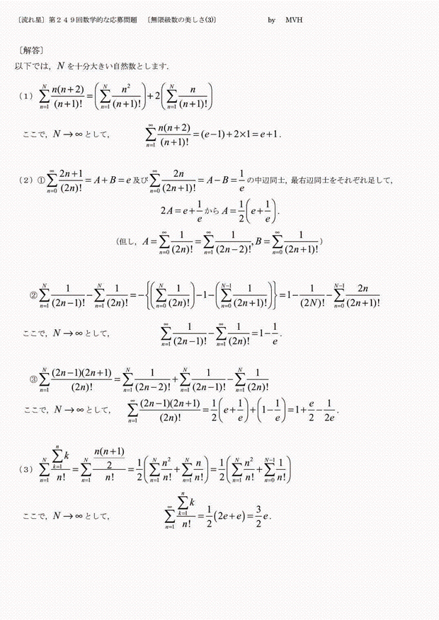 =Σ{(1/2)*(n^2/n!+1/(n-1)!} ←前回247回の(1)Σn^2/n!=2e より ^^