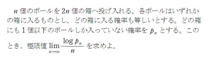 しかし,nの値が大きくなると,確率の値が小さいものとなり,試行回数をよほど大きくしないと,計算ができない.つまり箱の中のボールの数が1個以下となるのはほとんどあり得ないので,pn≒0であり,logpnが計算できない.現実では起こりえないものの確率を計算をすることに意味があるのか.日常生活の問題解決の為の数学ではなく,入試問題解答の為の数学を京大は出題しているのではないのか,と思った次第である.少しでもそう思ったことを反省している.