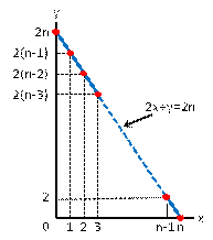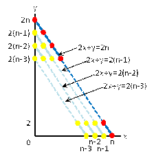 (1)の解は,直線 y = - 2x + 2n 上の格子点なので,