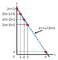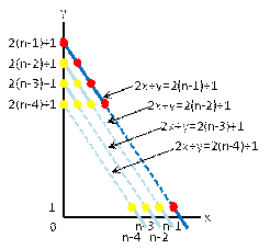(2)の解は,直線 y = - 2x + 2n+1 上の格子点なので,