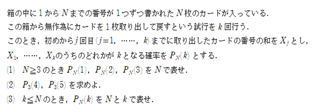 j≦k≦Nのとき,j回の試行でXj=kとなる場合は,k個の1を一列に並べ,その間にj−1個の仕切りを入れる場合である.ただし両端は仕切らない.