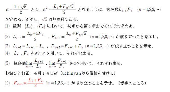 埼玉大学2007年の入試問題を改題しました。有名な2つの数列に関する問題です。