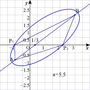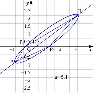 このとき,aが最小となるのは,グラフから,楕円が線分ABにつぶれるときである.