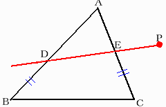 点Pを通って、AB,ACとそれぞれD,Eで交わり,BD=CEとなるような直線を引いてください。