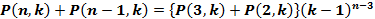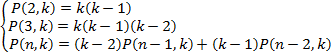 P(n-1,k) = (k-1) * (P(n-1,k) + P(n-2,k)) = …