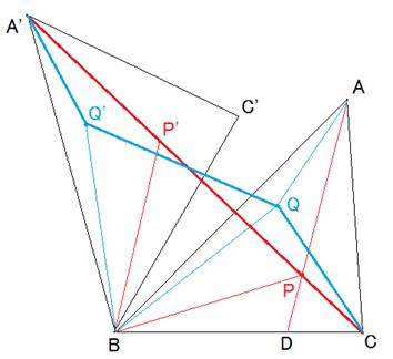 △BQQ' は正三角形になります。しかも,Q は B'A と A'C との交点だったので A'C 上にもあります。