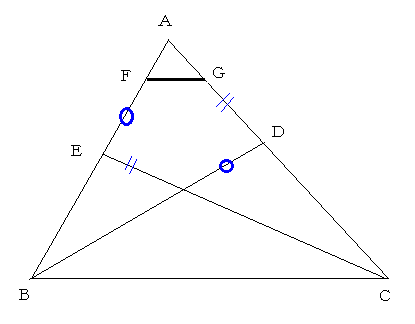 問題:△ABCは∠A=60°の三角形とする。∠B,∠Cの二等分線となるように辺AC,AB上に点D,Eをとる。さらに、BD=BF,CE=CGとなるような点F,Gが辺AB,AC上にそれぞれ存在するものとする。このとき、FG‖BCを証明せよ。