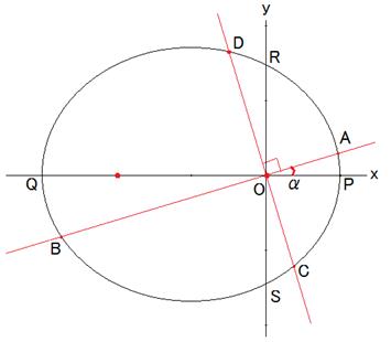 これは、楕円の焦点で直交する2つの割線が交点で分かれ、その長さの積の逆数の和は角αによらないことを示します。