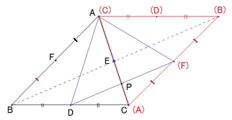 そこで,PC = AF,PC//AF となって □AFCP も平行四辺形で,PA = CF,です。