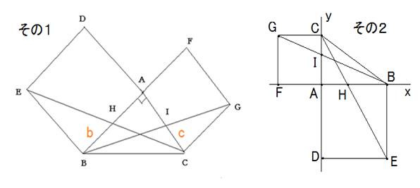 問題2:∠Aを直角とする直角三角形ABCにおいて、2辺AB,ACの上に正方形ADEB,AFGCを図のように作る。点Bと点G、点Cと点Eをそれぞれ結んで、辺ABと線分CEの交点をH,辺ACと線分Bgの交点をIとすれば、AH=AIをいろいろな解法で示してください。