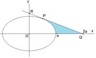 問題2:楕円b2x2+a2y2=a2b2に点A(2a,0)から接線を引いて、その接点をP(Pは第一象限)とするとき、楕円と接線とx軸とで囲まれた図形の面積を求めよ。また、接点Pの座標も求めよ。