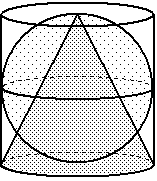 B.C.75年にシチリアの財務官が同地に赴いたとき、アクラディナの入り口で、イバラや雑木の茂みに覆われたアルキメデスの墓を見つけたと報告している。その墓碑には、図のような図形が刻まれていたという。この図形は、アルキメデスが『球と円柱について』において証明した「球の体積、表面積は、いずれもその外接円柱の2÷3である」ことを示すもので、このことに感動し、彼は、自分の墓石に円柱と球を描き、それらの体積の関係を言葉で書き記すように遺言にしたのである。<実際は円柱と球の図柄>