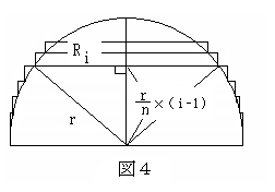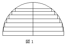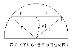 図1のように半径rの球を上下に2等分し、上半分を底面に平行にn等分する。n個に分けられた立体のそれぞれに、内接する「円柱」を考える。