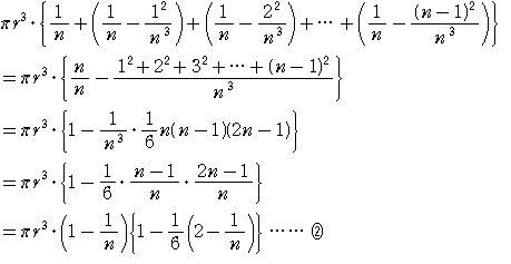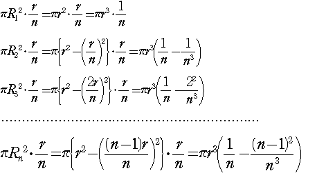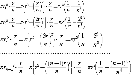 各円柱の高さはr÷nであるから、円柱の体積=π(半径)2×(高さ)より体積を下から順に計算していくと、