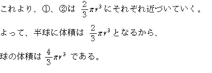 したがって、半球の体積は円柱の体積πr3から円錐の体積(1÷3)πr3を引いて(2÷3)πr3となる。これより、半径rの体積は(4÷3)πr3と導かれる。