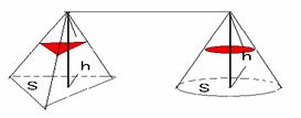 次に、「2つの立体を1つの平面に平行な平面で切ったとき、切り口の面積が常に等しいならば、2つの立体の体積が等しい。」という「カヴァリエリ(1598-1647)の原理」を用いて球の体積を求めてみます。これは、図のように、平面で切った切り口の面積が等しいならば、2つの立体、三角錐と円錐の体積が等しいということです。