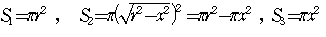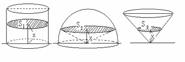 まず、円錐を逆にしておき、次に円柱、半球、円錐を図のように並べておく。これらの3つをすべて同じ高さ(ここでは底面からの高さをxとしておく)で切って切り口の面積を調べてみる。