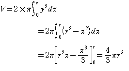 図の第1象限の部分をx軸の周りに1回転すると、半径rの半球になるから、体積をVとすると、