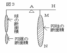 [(球)+(円錐ABC) ]:[(円柱)]=1:2となり、内項の積と外項の積が等しいことから、