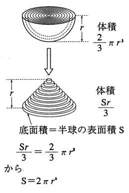 下の図を見てください。半径がrの半球の表面をタマネギの皮をむくように1枚1枚剥がしていき、それを平面に伸ばして上に重ねる。すると、図のような円錐台ができる。そこで、半球の表面積をSとすると、円錐台の底面積がSとなり、半球の体積と円錐台の体積が等しいことを利用して、S=2πr2を得る。