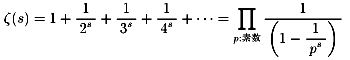 から出発する。ここに、右辺のpはすべての素数を渡る。オイラーはsが実数を扱ったが、リーマンはここでsを複素数とした。ζ(s)=0となるsが、0<Re s<1の範囲ではすべてs=1/2+it(tは実数)の形をしていると予想したのである。![]()