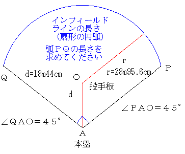 さらに、今夜「Jun」さんからも同じように、野球場の「インフィールド・ライン」の長さにの問題ですが、ざっと計算したところ、∠POQ≒144°となりました。sinθ=0.45023・・・をθ=27°と解いての話です。
