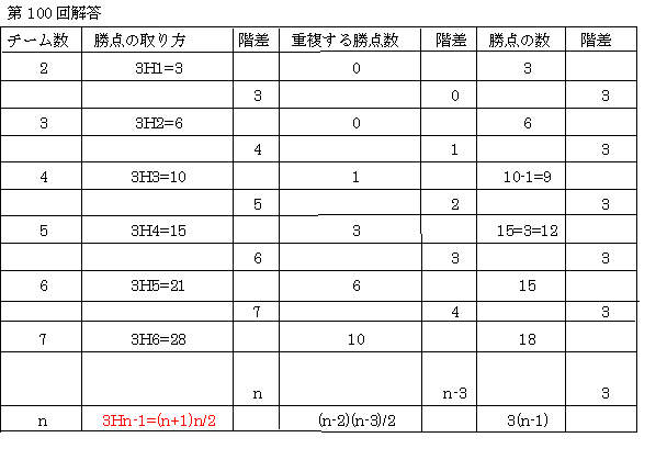 しかし、重複組み合わせの結果、勝ち点のとりかたが、チーム数の組み合わせ方と同じとは目からうろこです。