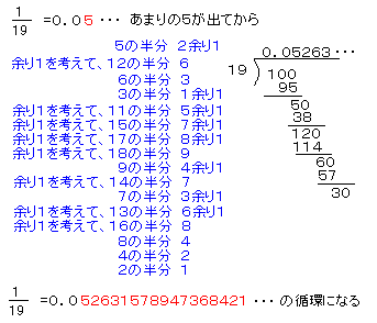 このとき、受けた問題を書きます。彼女が高校1年(記憶が定かでない?)のときに、レポート用紙で書いて渡してくれたのです。そのとき、見ただけですぐには納得できていませんでした。時々は、頭の隅にあったのですが、あれから20年近く経ってやっと、『1÷19を小数第30位までスピーディに求める方法』の解法がすんなり納得できたのです。