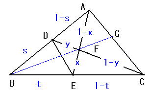 三角形ABE=t、三角形AEC=1−t、三角形BDE=st、三角形AFC=(1-t)(1-s)/1-st、