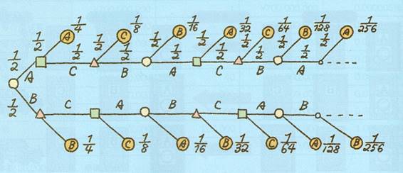 3人の実力を互角としたので,各人が各対戦で勝つ確率は1/2です。