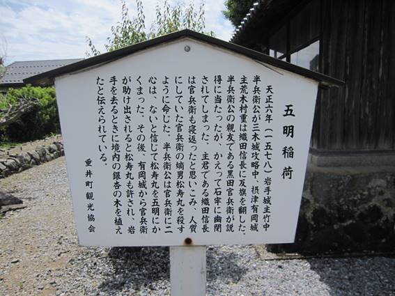 (3) この時、初めから松寿丸を匿う場所を五明の不破屋敷に定めていたのではないかと思われる。匿い先を竹中屋敷又は菩提山城とすることは、一般的には容易であったに違いない。然し、その行動は目立ち、例え家中に緘口令を敷いても、必ずその事は洩れ、その結果、大事かんこうれいを招くことになる。予めこの事を察知して、意表をついて、余り人目に付かない五明の地が選ばれたと考えられる。不破矢足の用心深さは、後に松寿丸の身代わりを立てたときに、すぐに松寿丸を女装させたという点からもうかがい知ることができる。