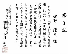 先日13日の講座を以て終了し、念願の修了証を教育委員会から頂きました。次は、来年、ガイドの登録を行ってから、実際に陣羽織を着て古戦場のガイドを行うことができます。