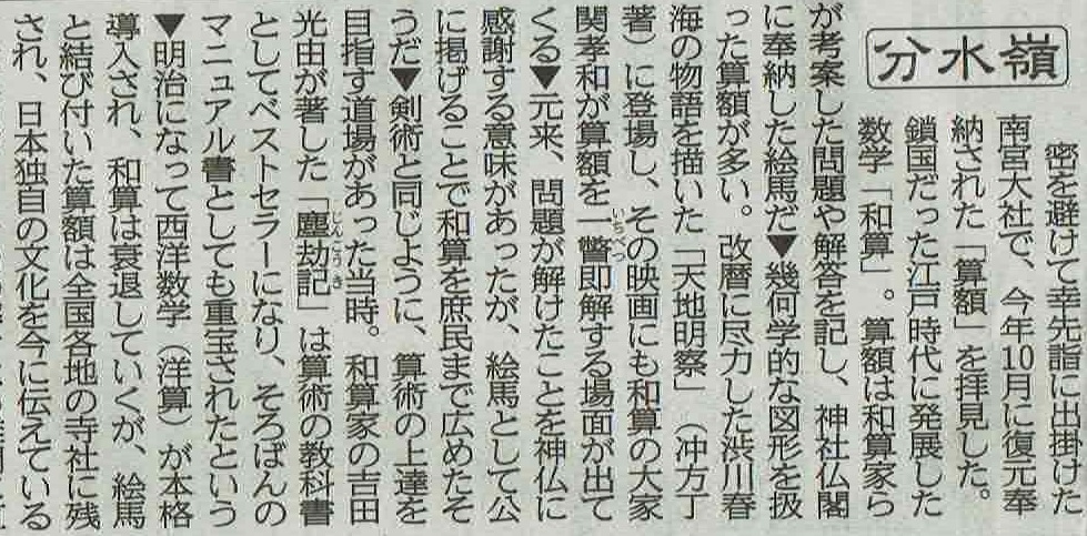 今朝友人から、岐阜新聞分水嶺に南宮大社の算額の記事が掲載されているとメールが来ました。