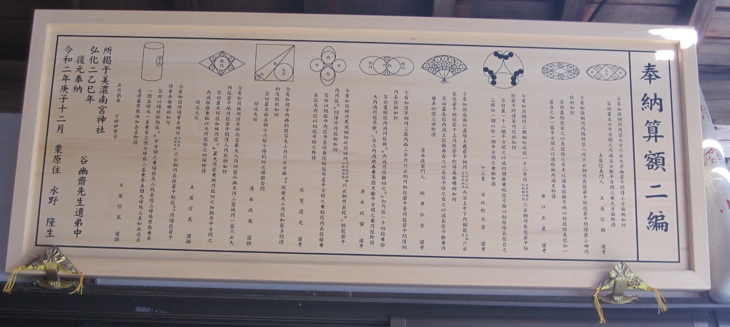 NO25:2020年10月10日(土)先日10月3日に南宮大社に念願であった天保13年(1842年)奉納された算額を復元することができました。皆様のおかげと感謝しています。
